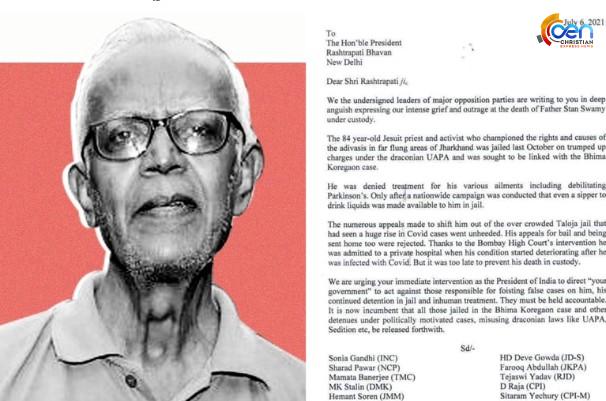 ഫാ. സ്റ്റാന് സ്വാമിയുടെ മരണത്തെക്കുറിച്ച് അന്വേഷണം നടത്തണം: രാഷ്ട്രപതിയ്ക്കു കത്തയച്ച് സംയുക്ത പ്രതിപക്ഷ നേതൃത്വം