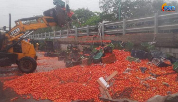 എക്സ്പ്രസ് ഹൈവേയില് ട്രക്ക് മറിഞ്ഞു; റോഡിലായത് 20 ടണ് തക്കാളി; വന് ഗതാഗതക്കുരുക്ക്