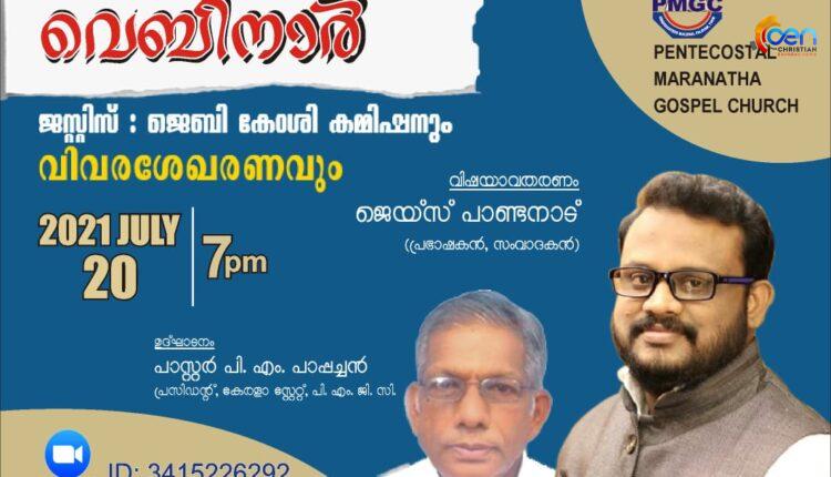തിരുവനന്തപുരം: പെൻ്റകോസ്തൽ മാറാനാഥാ ഗോസ്പൽ ചർച്ച് ( PMG) സംഘടിപ്പിക്കുന്ന വെബിനാർ ജൂലൈ 20 ന് ചൊവാഴ്ച വൈകിട്ട് 7 മണിക്ക് zoom പ്ലാറ്റ്ഫോമിൽ നടക്കും.