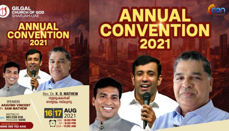 ഗിൽഗാൽ ചർച്ച് ഓഫ് ഗോഡ് യു.എ.യിയുടെ വാർഷിക കൺവെൻഷൻ 2021 ഓഗസ്റ്റ് 16, 17 തീയതികളിൽ, യു.എ.യി സമയം വൈകുന്നേരം 8.00 മണിക്ക് ആരംഭിക്കുന്ന മീറ്റിംഗ് ഗിൽഗാൽ ചർച്ച് ഓഫ് ഗോഡ് സ്ഥാപകപ്രസിഡന്റും ചർച്ച് ഓഫ് ഗോഡ് യു.എ.യി നാഷണൽ ഓവർസീയറുമായ റവ. ഡോ. കെ. ഒ. മാത്യൂ ഉദ്ഘാടനകർമ്മം നിർവ്വഹിച്ച് ശുശ്രൂഷകൾക്ക് നേതൃത്വം നൽകും. പാസ്റ്റർ അരവിന്ത് വിൻസന്റ്, പാസ്റ്റർ. സാം മാത്യൂഎന്നീ കർത്തൃദാസന്മാർ വചന പ്രഘോഷണം നിർവ്വഹിക്കുന്ന വാർഷിക കൺവെൻഷനിൽ ഗാന ശുശ്രൂഷപാസ്റ്റർ ലിബിൻ റാന്നിയും ബ്രദർ ബെൻസൺ ലൂക്കോസും ചേർന്ന് നയിക്കും. ഈ സുവിശേഷമഹായോഗത്തിൽ സൂമിലൂടെ ഏവർക്കും പങ്ക് ചേരുവാൻ കഴിയും
