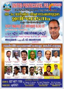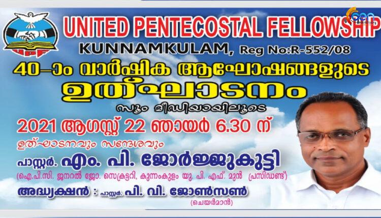 കുന്നംകുളം: പെന്തക്കോസ്ത് സഭകളുടെ ഐക്യ വേദിയായ യുണൈറ്റഡ് പെന്തക്കോസ്തൽ ഫെലോഷിപ്പിന്റെ നാൽപ്പതാം വാർഷിക ആഘോഷങ്ങളും ഉത്ഘാടനവും ആഗസ്റ്റ് 22 ന് സും വേദിയാക്കി നടത്തപ്പെടും. ഞായർ വൈകുന്നേരം 6.30 ന് പാസ്റ്റർ. പി. വി. ജോൺസന്റെ അദ്ധ്യക്ഷതയിൽ ആരംഭിക്കുന്ന മീറ്റിംഗ് ഐ.പി.സി. ജനറൽ ജോ.സെക്രട്ടറി പാസ്റ്റർ. എം. പി. ജോർജ്ജുകുട്ടി ഉത്ഘാടനവും മുഖ്യ സന്ദേശവും നൽകും. ബ്രദർ പ്രഫിൻ ജേക്കബ്, ബ്രദർ ബെന്നി എന്നിവർ സംഗീത ശിശ്രൂഷകൾക്ക് നേതൃത്വം നൽകും.