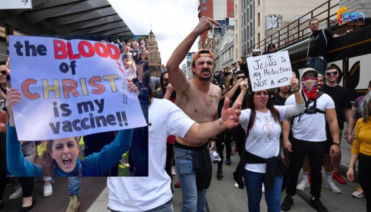 ലോക്ക്ഡൗൺ പ്രതിഷേധത്തിൽ “വാക്സിൻ അല്ല യേശുവാണ് എന്റെ സംരക്ഷണം” പ്ലക്കാടുമായി വാക്സിൻ വിരുദ്ധ വികാരം
