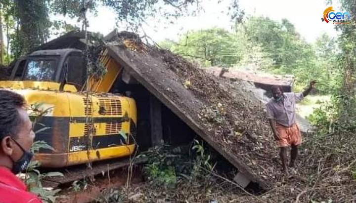 മൂന്നുനില കെട്ടിടം പൊളിക്കുന്നതിനിടെ കോൺക്രീറ്റ് മേൽക്കുര ജെ.സി.ബിയുടെ മുകളിലേക്ക് മറിഞ്ഞു വീണു. ദേശീയ പാതാ വികസനത്തിന്റെ ഭാഗമായി കാസർകോട് കാലിക്കടവിൽ മൂന്നുനില കെട്ടിടം പൊളിക്കുമ്പോഴായിരുന്നു അപകടം.