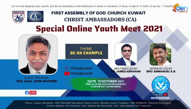 FIRST ASSEMBLY OF GOD CHURCH KUWAIT CHRIST AMBASSADORS SPECIAL ONLINE YOUTH MEET 2021 GUEST SPEAKER EVG. SAJU JOHN MATHEW
