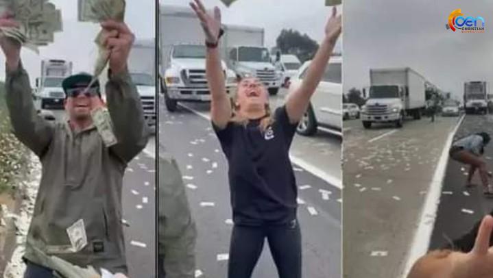 റോഡിൽ കറൻസി നോട്ടുകൾ ചിതറിവീഴുന്നതുകണ്ട് അമ്പരന്ന് യാത്രക്കാർ. പലരും വാഹനം നിർത്തി ഇറങ്ങി നോട്ടുകൾ ശേഖരിച്ചു. മറ്റുപലരും നോട്ടുകൾ വാരിയെടുത്ത് വീണ്ടും വലിച്ചെറിഞ്ഞു. തെക്കൻ കാലിഫോർണിയയിലെ കാൾസ്ബാഡിലാണ് സംഭവം.