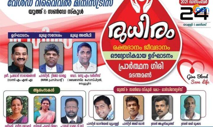വേൾഡ് റിവൈവൽ മിനിസ്ട്രീസ് യുവജനവിഭാഗമായ യൂത്ത് & സൺഡേ സ്കൂൾ രുധിരം എന്ന പേരിൽ രക്തദാനം ജീവദാന ഔദ്യോഗികമായ ഉദ്ഘാടനം 2021 ഡിസംബർ 24 വെള്ളി 5 മണിക്ക് മടന്തമൺ പ്രാർത്ഥന ഗിരി വെച്ച് റാന്നി യുടെ എംഎൽഎ ശ്രീ. പ്രമോദ് നാരായണൻ ഉദ്ഘാടനം ചെയ്യുന്നു.