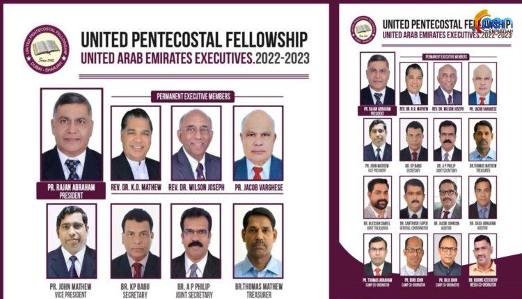 ദുബായ് : യുണൈറ്റഡ് പെന്തക്കൊസ്തൽ ഫെല്ലോഷിപ് (യു പി എഫ് )യു എ ഇ 2022-23 വർഷത്തേക്കുള്ള പുതിയ ഭാരവാഹികളെ തെരഞ്ഞെടുത്തു. പാസ്റ്റർ രാജൻ എബ്രഹാം (പ്രസിഡന്റ്), പാസ്റ്റർ ജോൺ മാത്യു (വൈസ് പ്രസിഡന്റ്), കെ പി ബാബു (സെക്രട്ടറി) എ പി ഫിലിപ്പ് (ജോ. സെക്രട്ടറി), തോമസ് മാത്യു (ട്രഷറർ), ബ്ലെസ്സെൻ ഡാനിയേൽ (ജോ. ട്രഷറർ), സന്തോഷ് ഈപ്പൻ (ജനറൽ കോർഡിനേറ്റർ), ജേക്കബ് ജോൺസൻ, ഷാജി എബ്രഹാം (ഓഡിറ്റർ), പാസ്റ്റർ തോമസ് എബ്രഹാം, പാസ്റ്റർ ബിനു ജോൺ, പാസ്റ്റർ ഡിലൂ ജോൺ (ക്യാമ്പ് കോർഡിനേറ്റേഴ്സ്), റോബിൻസ് കീച്ചേരി (മീഡിയ കോർഡിനേറ്റർ), ഡോ. കെ ഒ മാത്യു, ഡോ. വിൽസൺ ജോസഫ്, പാസ്റ്റർ ജേക്കബ് വർഗീസ് (സ്ഥിരം എക്സിക്യൂട്ടീവ് അംഗങ്ങൾ) എന്നിവരാണ് ഭാരവാഹികൾ.