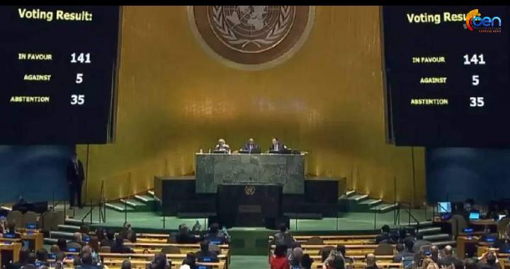 റഷ്യക്കെതിരായ യുഎന് പ്രമേയം : അനുകൂലിച്ചത് 141 രാജ്യങ്ങള്, എതിര്ത്തത് അഞ്ച്, വിട്ടുനിന്നത് ഇന്ത്യ ഉള്പ്പടെ 35 രാജ്യങ്ങള്