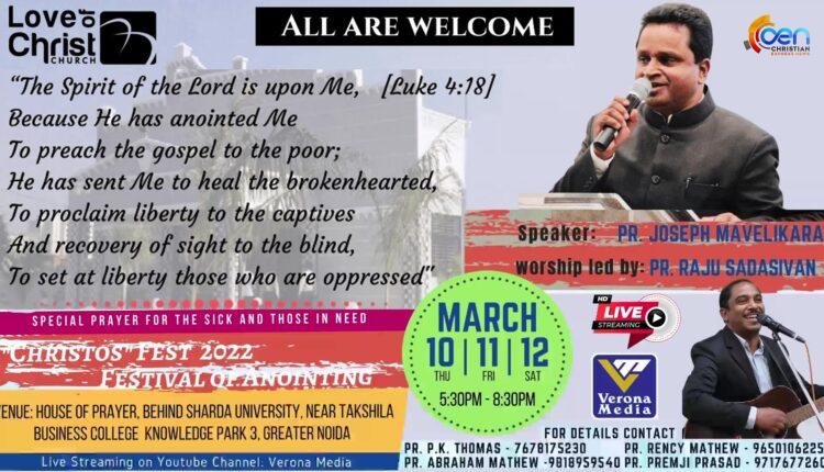 Live CHRISTOS FEST 2022 FESTIVAL OF ANOINTING DAY-3 | SPEAKER PASTOR JOSEPH MAVELIKARA. On Mar 12, 2022 0 Share Share this on WhatsAppCHRISTOS FEST 2022 FESTIVAL OF ANOINTING DAY-3 | SPEAKER PASTOR JOSEPH MAVELIKARA. Share this on WhatsApp Continue Reading 0 Share WhatsAppFacebookTwitterViberPinterestEmail