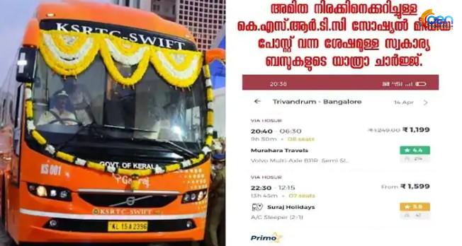 തിരുവനന്തപുരം: കെഎസ്ആർടിസിയുടെ സ്വിഫ്റ്റ് ബസുകൾ (KSRTC Swift) നിരത്തിലിറങ്ങിയതോടെ സ്വകാര്യ ബസുകൾ നിരക്ക് കുറച്ചെന്ന് കെഎസ്ആർടിസി. സ്വകാര്യബസുകളുടെ നിരക്കിന്റെ സ്ക്രീൻ ഷോട്ട് സഹിതമാണ് കെഎസ്ആർടിസിയുടെ അവകാശവാദം. ദീർഘദൂര യാത്രക്കാരിൽ നിന്ന് സ്വകാര്യ ബസുകൾ അമിത നിരക്ക് ഈടാക്കുകയാണെന്ന് ആരോപിച്ച് കഴിഞ്ഞ ദിവസം കെഎസ്ആർടിസി ഫേസ്ബുക്കിൽ കുറിപ്പിട്ടിരുന്നു. ഇതിനു പിന്നാലെയാണ് സ്വകാര്യ ബസുകൾ നിരക്കുകുറച്ചതെന്നും കെഎസ്ആർടിസി അവകാശവാദമുന്നയിക്കുന്നു.
