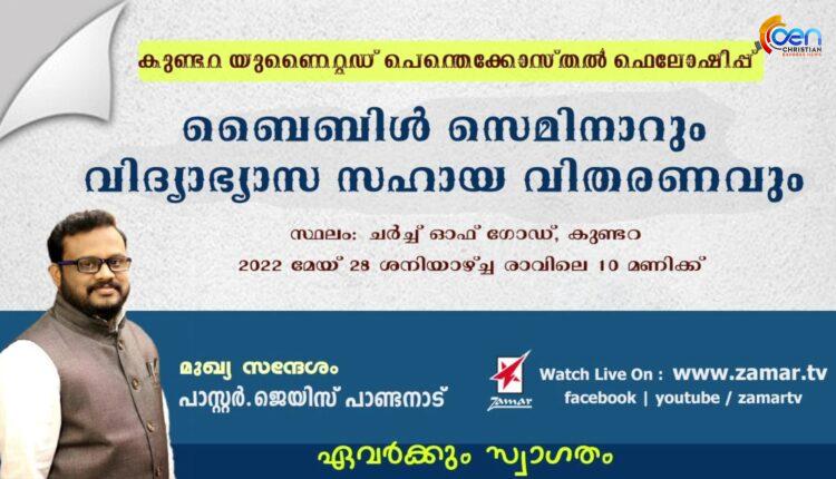 Pr.Jaise Pandanad | ബൈബിൾ സെമിനാറും വിദ്യാഭ്യാസ സഹായ വിതരണവും | കുണ്ടറ UPF | Watch Live On Zamar TV