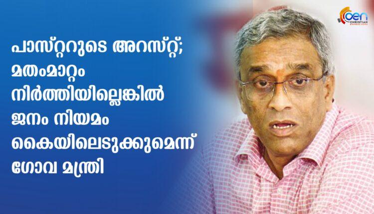 പാസ്റ്ററുടെ അറസ്റ്റ്; മതംമാറ്റം നിർത്തിയില്ലെങ്കിൽ ജനം നിയമം കൈയിലെടുക്കുമെന്ന് ഗോവ മന്ത്രി