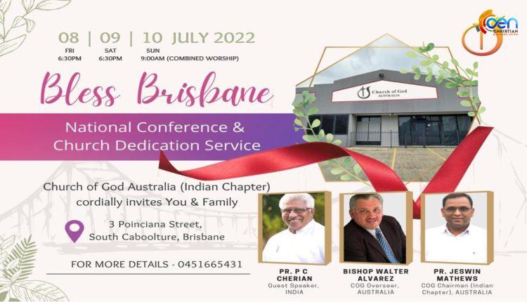 ചർച്ച് ഓഫ് ഗോഡ് ഓസ്ട്രേലിയയുടെ ഇൻഡ്യൻ ചാപ്റ്ററിന്റെ മൂന്നാമത് നാഷണൽ കോൺഫറൻസിനും ആലയ സമർപ്പണ ശുശ്രുഷക്കും ബ്രിസ്ബൺ കബൂൾചർ വേദിയാകുന്നു. 2022 ജൂലൈ മാസം 8,9,10 തീയതികളിൽ ബ്രിസ്ബെയ്നിൽ വച്ച് നടത്തുവാൻ തീരുമാനിച്ചിരിക്കുന്ന പ്രസ്തുത മീറ്റിംഗുകൾക്ക് ഓസ്ട്രേലിയ ചർച്ച് ഓഫ് ഗോഡ് ഓവർസീയർ റവ. ബിഷപ് വാൾട്ടർ അൾവാറസ് ഉദ്ഘാടനം നിർവ്വഹിക്കും.