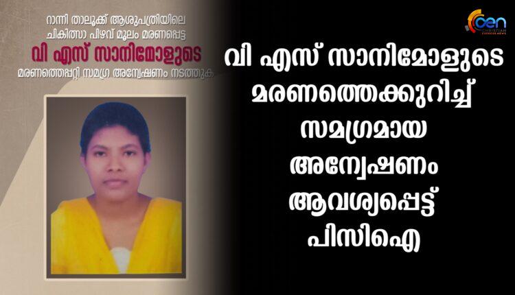 റാന്നി: റാന്നി താലൂക്ക് ആശുപത്രിയിലെ ചികിത്സാ പിഴവ് മൂലം മരണപ്പെട്ട വി എസ് സാനിമോളുടെ മരണത്തെപ്പറ്റി സമഗ്ര അന്വേഷണം നടത്തണമെന്ന് പിസി ഐ സ്റ്റേറ്റ് കമ്മിറ്റി ആവശ്യപ്പെട്ടു.