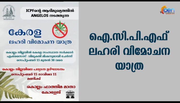 ഐ. സി. പി. എഫ് ന്റെ ആഭിമുഖ്യത്തിൽ എയ്ഞ്ചലോസ് നടത്തുന്ന ലഹരി വിമോചന യാത്ര സെപ്റ്റംബർ 15 മുതൽ 30 വരെ കൊല്ലം ജില്ലയിൽ വിവിധ ഇടങ്ങളിലായി പരിപാടികൾ സംഘടിപ്പിക്കും.