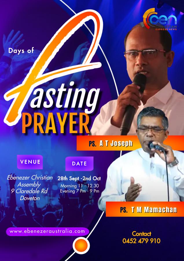 മെൽബൺ: എബനേസർ ക്രിസ്ത്യൻ അസ്സംബ്ലി സഭയുടെ 21 ദിവസ ഉപവാസ പ്രാർത്ഥനാ സമാപന ശുശ്രൂഷകൾ ഇന്നലെ ആരംഭിച്ചു. സെപ്റ്റംബർ 12 ന് സഭാ ആസ്ഥാനമായ ഡൗട്ടണിൽ ആരംഭിച്ച ഉപവാസപ്രാർത്ഥന ഒക്റ്റോബർ രണ്ട് ഞായറാഴ്ച്ച ആരാധനയോട് ചേർന്നുള്ള കർത്തൃമേശയോടെ സമാപനം കുറിക്കും.