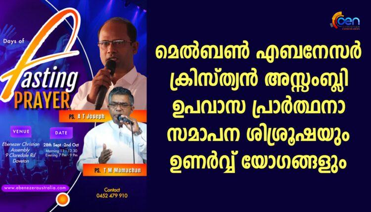 മെൽബൺ എബനേസർ ക്രിസ്ത്യൻ അസ്സംബ്ലി ഉപവാസ പ്രാർത്ഥനാ സമാപന ശിശ്രൂഷയും ഉണർവ്വ് യോഗങ്ങളും