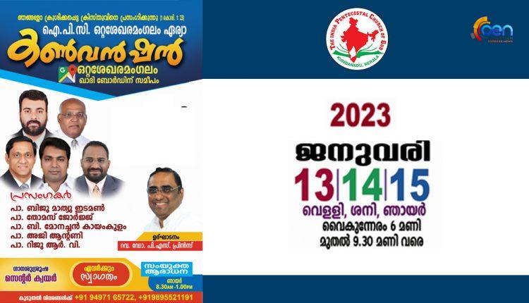 ഒറ്റശേഖരമംഗലം : ഇന്ത്യ പെന്തക്കോസ്ത് ദൈവസഭ ഒറ്റശേഖരമംഗലം ഏരിയ 10-മത് വാർഷിക കൺവെൻഷൻ 2023 ജനുവരി 13 മുതൽ 15 വരെ ഒറ്റശേഖരമംഗലം ഖാദി ബോർഡിന് സമീപം തയ്യാറാക്കിയ ഗ്രൗണ്ടിൽ നടക്കും. ഏരിയ കൺവീനർ റവ. ഡോ. പി. എസ്. പ്രിൻസ് ഉദ്ഘാടനം നിർവഹിക്കും. പാസ്റ്റർമാരായ ബിജു മാത്യു ഇടമൺ, ബി. മോനച്ചൻ കായംകുളം, തോമസ് ജോർജ് പത്തനാപുരം, അജി ആൻറണി, റിജു ആർ. വി. എന്നിവർ ദൈവവചനം സംസാരിക്കും. ഏരിയ ക്വയർ ഗാന ശുശ്രൂഷയ്ക്ക് നേതൃത്വം നൽകും. ശനി രാവിലെ 10 മണി മുതൽ മാസ യോഗവും ശനി ഉച്ചയ്ക്ക് രണ്ടു മണിമുതൽ പി വൈപിഎ സൺഡേസ്കൂൾ സംയുക്ത വാർഷികവും ഞായർ രാവിലെ 8.30. മുതൽ സംയുക്ത സഭ യോഗവും നടക്കും