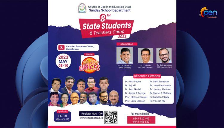 മുളക്കുഴ: ചര്ച്ച് ഓഫ് ഗോഡ് കേരളാ സ്റ്റേറ്റ് സണ്ടേസ്കൂള് സംസ്ഥാന അദ്ധ്യാപക വിദ്യാര്ത്ഥി ക്യാമ്പ് മെയ് 8, 9, 10 തീയതികളില് ചരല്ക്കുന്നില് നടക്കും. സംസ്ഥാന പ്രസിഡന്റ് പാസ്റ്റര് ജെ. ജോസഫിന്റെ അദ്ധ്യക്ഷതയില് സ്റ്റേറ്റ് ഓവര്സിയര് പാസ്റ്റര് സി.സി. തോമസ് ക്യാമ്പ് ഉദ്ഘാടനം ചെയ്യും. കേരളത്തിലെ പത്ത് മേഖലകളില് നിന്നും കുട്ടികളും അദ്ധ്യാപകരും ക്യാമ്പില് പങ്കെടുക്കും. പ്രഗത്ഭരായ അദ്ധ്യാപകര് ക്ലാസ്സുകള് നയിക്കും.