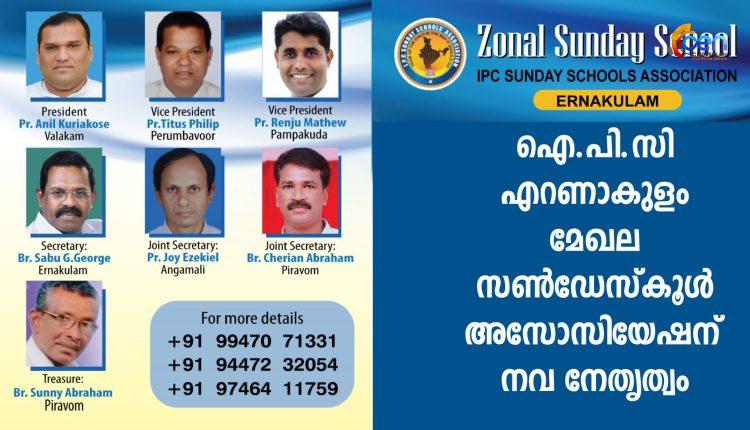 ഐ.പി.സി സൺഡേസ്കൂൾ അസോസിയേഷൻ എറണാകുളം മേഖലയ്ക്ക് പുതിയ ഭാരവാഹികളെ തിരഞ്ഞെടുത്തു. പ്രസിഡൻ്റ് പാസ്റ്റർ അനിൽ കുര്യാക്കോസ് വാളകം, വൈസ് പ്രസിഡന്റ്മാരായ പാസ്റ്റർ ടൈറ്റസ് ഫിലിപ്പ് പെരുമ്പാവൂർ, പാസ്റ്റർ രെഞ്ചു മാത്യു പാമ്പാക്കുട, സെക്രട്ടറി ബ്രദർ. ജി .സാബു എറണാകുളം, ജോയിൻ സെക്രട്ടറിമാരായ പാസ്റ്റർ ജോയ് യെഹസ്ക്കിയേൽ അങ്കമാലി, ബ്രദർ. ചെറിയാൻ എബ്രഹാം പിറവം, ട്രഷററായി ബ്രദർ സണ്ണി എബ്രഹാം പിറവം എന്നിവരാണ് പുതിയ ഭാരവാഹികൾ