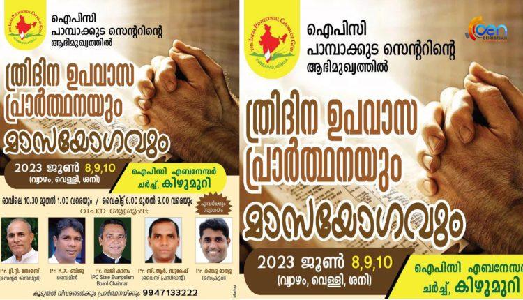 പാമ്പാക്കുട : ഐപിസി പാമ്പാക്കുട സെന്ററിന്റെ ആഭിമുഖ്യത്തിൽ ജൂൺ 8 9 10 (വ്യാഴം -ശനി) ദിവസങ്ങളിൽ ഉപവാസ പ്രാർത്ഥനയും, മാസയോഗവും ഐ.പി.സി ഏബനേസർ കീഴുമുറി ചർച്ചിൽ ക്രമീകരിച്ചിരിക്കുന്നു. കർത്താവിൽ അനുഗ്രഹീതരായ ദൈവദാസന്മാർ ദൈവവചനം ശുശ്രൂഷിക്കുന്നു. ഈ യോഗങ്ങളിലേക്ക് ഏവരെയും ഹൃദയംഗമായി സ്വാഗതം ചെയ്യുന്നു.