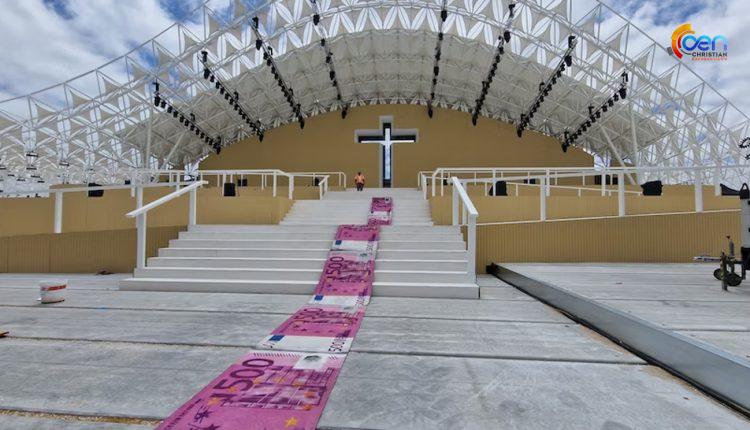 മാര്പ്പാപ്പയുടെ സന്ദര്ശനച്ചെലവിനെതിരെ കലാകാരന്: വേദിയില് നോട്ടുകള് കൊണ്ട് പരവതാനി വിരിച്ച് പ്രതിഷേധം