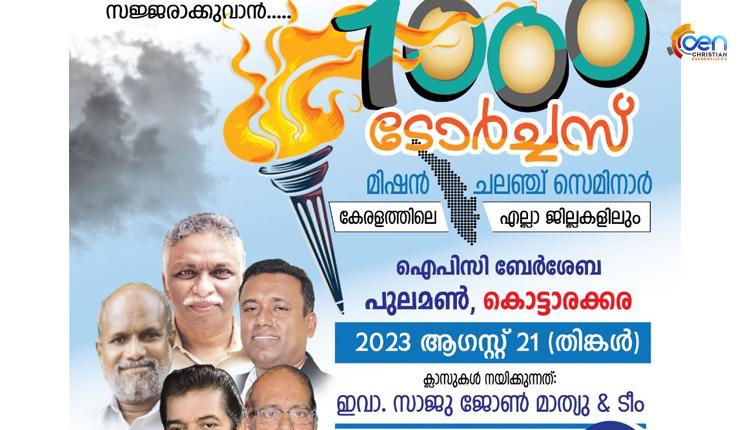 സംഘടനാ വ്യത്യാസമില്ലാതെ പാസ്റ്റേഴ്സിനേയും വിശ്വാസ സമൂഹത്തേയും സുവിശേഷികരണത്തിനായി സജ്ജരാക്കുവാൻ ടോർച്ചസ് 1000 മിഷൻ ചലഞ്ച് സെമിനാർ കേരളത്തിലെ എല്ലാ ജില്ലകളിലും നടത്തപ്പെടുന്നു. 2023 ആഗസ്റ്റ് 21 തിങ്കൾ രാവിലെ 10 മുതൽ വൈകിട്ട് 4 മണി വരെ കൊട്ടാരക്കരയിൽ വച്ച് നടക്കുന്നു. ഇവാ. സാജു ജോൺ മാത്യു & ടിം ക്ലാസ് നയിക്കുന്നു.