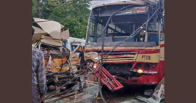 പന്തളം കൂരമ്പാലയ്ക്കടുത്ത് വെച്ച് കെഎസ്ആർടിസി ബസും ഡെലിവറി വാനും കൂട്ടിയിടിക്കുകയായിരുന്നു. പന്തളം ഭാഗത്ത് നിന്നും അടൂർ ഭാഗത്തേക്ക് വന്ന ഡെലിവറി വാൻ കെഎസ്ആർടിസി ബസിൽ ഇടിക്കുകയായിരുന്നു. വാനിലെ ഡ്രൈവർ ഉറങ്ങിപ്പോയതാണ് അപകടത്തിന് കാരണമെന്നാണ് പ്രാഥമിക നിഗമനം. വാനിലുണ്ടായിരുന്ന രണ്ട് പേർ സംഭവ സ്ഥലത്ത് വെച്ച് തന്നെ മരിച്ചു. ബസിലുണ്ടായിരുന്ന 15 പേർക്കാണ് പരിക്കേറ്റത്.