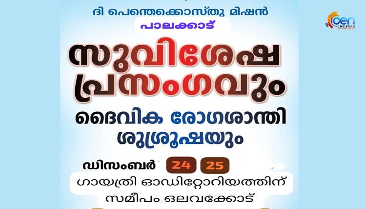 പാലക്കാട്: ദി പെന്തെക്കൊസ്ത് മിഷൻ പാലക്കാട് സഭയുടെ ആഭിമുഖ്യത്തിൽ സുവിശേഷ പ്രസംഗം ഡിസംബർ 24, 25 തീയതികളിൽ ഒലവക്കോട് പുതിയ പാലത്തിനു സമീപമുള്ള ഗായത്രി ഓഡിറ്റോറിയം ഗ്രൗണ്ടിൽ നടക്കും. നാളെയും മറ്റന്നാളും വൈകിട്ട് 5.45 ന് സുവിശേഷ പ്രസംഗവും തിങ്കളാഴ്ച പകൽ യുവജന മീറ്റിങ്ങും നടക്കും.