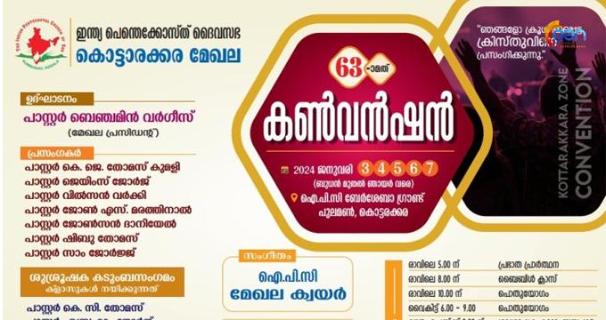 കൊട്ടാരക്കര : ഇൻഡ്യാ പെന്തെക്കൊസ്ത് ദൈവസഭ കൊട്ടാരക്കര മേഖല 63-ാമത് കൺവെൻഷൻ ജനുവരി 3 മുതൽ 7 വരെ കൊട്ടാരക്കര പുലമൺ ബേർശേബാ ഗ്രൗണ്ടിൽ നടക്കും.