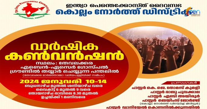 കൊല്ലം : ഐപിസി കൊല്ലം നോർത്ത് സെന്റർ കൺവൻഷൻ ജനു.10- 14 വരെ ഐപിസി തേവലക്കര എബെൻ – ഏസെർ ഗോസ്പൽ സെന്റർ ഗ്രൗണ്ടിൽ നടക്കും.
