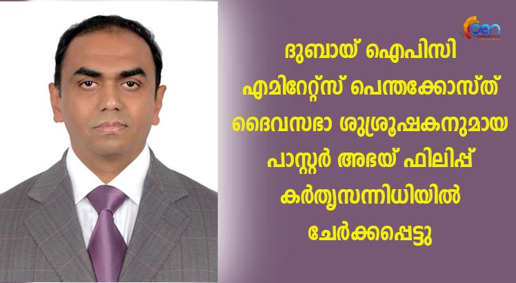 ദുബായ് ഐപിസി എമിറേറ്റ്സ് പെന്തക്കോസ്ത് ദൈവസഭാ ശുശ്രൂഷകനുമായ പാസ്റ്റർ അഭയ് ഫിലിപ്പ് കർതൃസന്നിധിയിൽ ചേർക്കപ്പെട്ടു