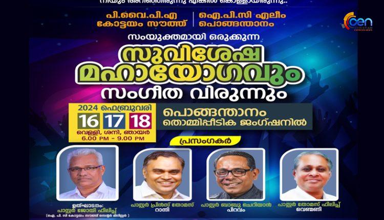 പൊങ്ങന്താനം : പി. വൈ. പി. എ കോട്ടയം സൗത്ത് സെന്ററിന്റെയും ഐ. പി. സി എലീം പൊങ്ങന്താനം സഭയുടെയും ആഭിമുഖ്യത്തിൽ 2024 ഫെബ്രുവരി 16,17,18 വെള്ളി ശനി, ഞായർ ദിവസങ്ങളിൽ പൊങ്ങന്താനം തൊമ്മിപ്പീടിക ജംഗ്ഷനിൽ വെച്ച് സുവിശേഷ മഹായോഗവും സംഗീത വിരുന്നും നടക്കും. കോട്ടയം സൗത്ത് സെന്റർ മിനിസ്റ്റർ പാസ്റ്റർ ജോയി ഫിലിപ്പ് ഉത്ഘാടനം ചെയ്യും. ദിവസവും വൈകുന്നേരം 6 മുതൽ നടക്കുന്ന യോഗങ്ങളിൽ കർത്താവിൽ പ്രസിദ്ധരായ പാസ്റ്റർ പ്രിൻസ് തോമസ് (റാന്നി) , പാസ്റ്റർ ബാബു ചെറിയാൻ (പിറവം) , പാസ്റ്റർ തോമസ് ഫിലിപ്പ് (വെൺമണി) എന്നിവർ ദൈവ വചനം സംസാരിക്കും. ക്രൈസ്തവ കൈരളിക്ക് സുപരിചിതരായ ബ്രദർ ഇമ്മാനുവേൽ കെ. ബി,ബ്രദർ ടിബിൻ തങ്കച്ചൻ, ബ്രദർ ഷാരോൺ വർഗീസ്, ബ്രദർ ജീസൺ ജോർജ് എന്നിവർ ചേർന്ന് സംഗീത ശുശ്രൂഷക്ക് നേതൃത്വം നൽകും. ഇവരോടൊപ്പം ചേർന്ന് പി. വൈ. പി. എ ക്വയർ ഗാനങ്ങൾ ആലപിക്കും. പാസ്റ്റർ ജിബു മാത്യു, ബ്രദർ കെ. പി. ശ്രീകുമാർ, ബ്രദർ ഫെന്നി സാം ജോൺ, ബ്രദർ എൻ. കെ അച്ചൻകുഞ്ഞ് തുടങ്ങിയവർ നേതൃത്വം നൽകും.