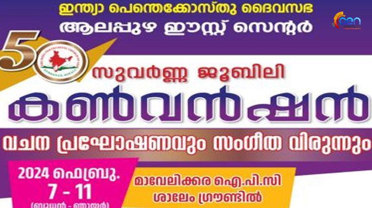 മാവേലിക്കര : ഐ.പി.സി ആലപ്പുഴ ഈസ്റ്റ് സെൻററിൻ്റെ സുവർണ്ണ ജൂബിലി കൺവൻഷൻ ഫെബ്രു 7-11 വരെ മാവേലിക്കര ഐ.പി.സി. ശാലേം ഗ്രൗണ്ടിൽ നടക്കും. സെൻ്റർ ശുശ്രൂഷകൻ പാസ്റ്റർ ബി. മോനച്ചൻ കായംകുളം ഉദ്ഘാടനം ചെയ്യും. പാസ്റ്റർമാരായ എം.വി. വർഗ്ഗീസ്, ദാനിയേൽ കൊന്നനിൽക്കുന്നതിൽ (ഐ.പി.സി. സ്റ്റേറ്റ് സെക്രട്ടറി), പ്രിൻസ് തോമസ് റാന്നി, റെജി ശാസ്താംകോട്ട, ഷാജി എം പോൾ വെണ്ണിക്കുളം, വി.പി.ജോസ്, എന്നിവർ പ്രസംഗിക്കും.