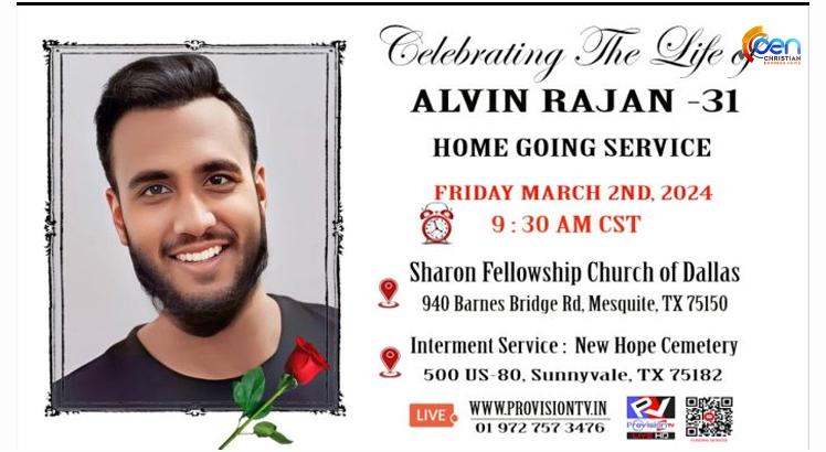 ഡാളസ് : മാർച്ച് 16 ശനിയാഴ്ച പുലർച്ചെ ഡാളസിൽ ബൈക്ക് അപകടത്തിൽ മരിച്ച മലയാളി യുവാവ് ആൽവിൻ രാജന്റെ(31) പൊതുദർശനവും, സംസ്കാര ശുശ്രുഷയും മാർച്ച് 22 വെള്ളിയാഴ്ച രാവിലെ 9.30 മുതൽ മെസ്കിറ്റിലുള്ള ശാരോൻ ഫെലോഷിപ്പ് ചർച്ചിൽ വെച്ച് നടക്കും.