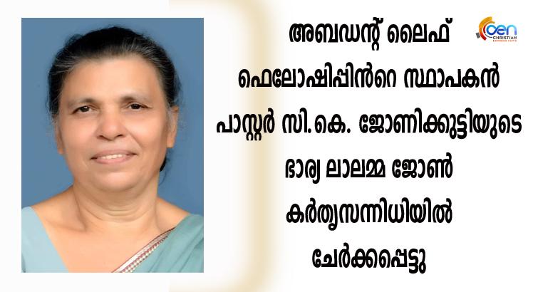 അബഡന്റ് ലൈഫ് ഫെലോഷിപ്പിൻറെ സ്ഥാപകൻ പാസ്റ്റർ സി.കെ. ജോണിക്കുട്ടിയുടെ ഭാര്യ ലാലമ്മ ജോൺ കർതൃസന്നിധിയിൽ ചേർക്കപ്പെട്ടു