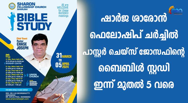 ഷാർജ ശാരോൻ ഫെലോഷിപ് ചർച്ചിൽ പാസ്റ്റർ ചെയ്സ് ജോസഫിൻ്റെ ബൈബിൾ സ്റ്റഡി ഇന്ന് മുതൽ 5 വരെ