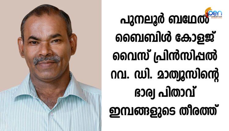 Obituary പുനലൂർ ബഥേൽ ബൈബിൾ കോളജ് വൈസ് പ്രിൻസിപ്പൽ റവ. ഡി. മാത്യൂസിന്റെ ഭാര്യ പിതാവ് ഇമ്പങ്ങളുടെ തീരത്ത് Last updated May 29, 2024 0 Share Share this on WhatsApp വള്ളികുന്നം : പുനലൂർ ബഥേൽ ബൈബിൾ കോളജ് വൈസ് പ്രിൻസിപ്പൽ റവ. ഡി. മാത്യൂസിന്റെ ഭാര്യ പിതാവ് പുത്തൻചന്ത റോസി വില്ലയിൽ ബേബി കെ. പി. (70) കർത്താവിൽ നിദ്ര പ്രാപിച്ചു. സംസ്കാരം 2024 ജൂൺ 3 – ന് രാവിലെ 9 മണി മുതൽ വള്ളികുന്നം എ. ജി. സഭാംഗണത്തിൽ Share this on WhatsApp Continue Reading 0 Share WhatsAppFacebookTwitterViberPinterestEmail