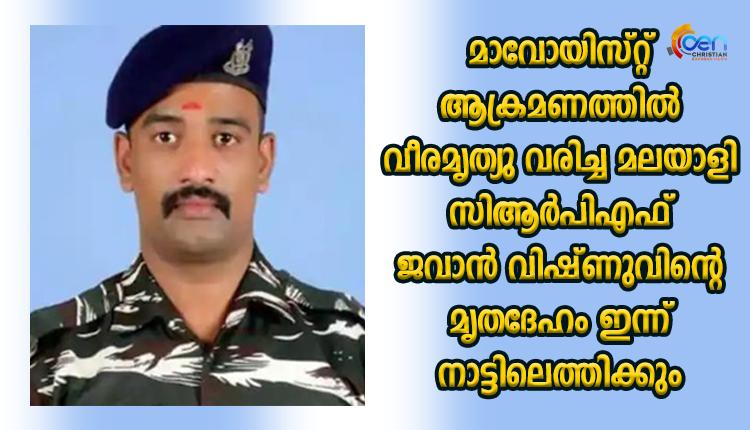 മാവോയിസ്റ്റ് ആക്രമണത്തില് വീരമൃത്യു വരിച്ച മലയാളി സിആര്പിഎഫ് ജവാന് വിഷ്ണുവിന്റെ മൃതദേഹം ഇന്ന് നാട്ടിലെത്തിക്കും