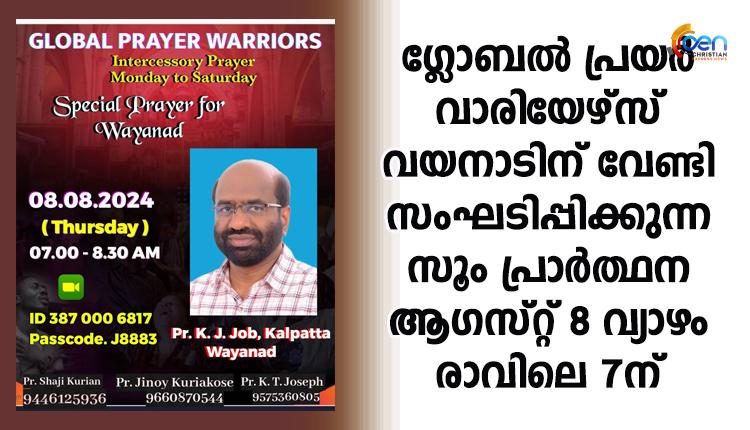 ഗ്ലോബൽ പ്രയർ വാരിയേഴ്സ് വയനാടിന് വേണ്ടി സംഘടിപ്പിക്കുന്ന സൂം പ്രാർത്ഥന ആഗസ്റ്റ് 8 വ്യാഴം രാവിലെ 7ന്