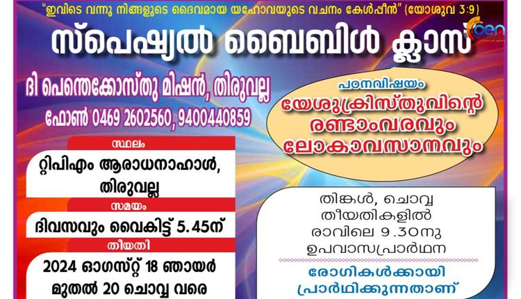 റ്റി.പി.എം തിരുവല്ല സെന്റർ: സ്പെഷ്യൽ ബൈബിൾ ക്ലാസ് ആഗസ്റ്റ് 18 മുതൽ