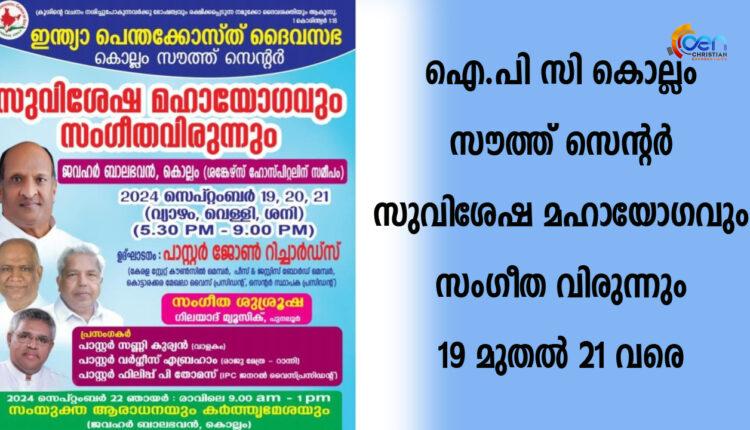 ഐ.പി സി കൊല്ലം സൗത്ത് സെൻ്റർ സുവിശേഷ മഹായോഗവും സംഗീത വിരുന്നും 19 മുതൽ 21 വരെ