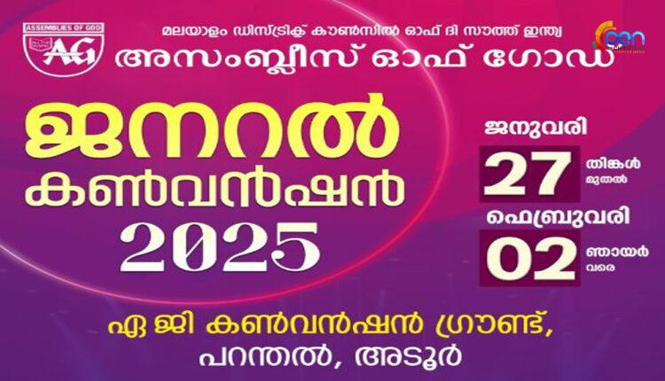 അടൂർ: അസംബ്ലീസ് ഓഫ് ഗോഡ് മലയാളം ഡിസ്ട്രിക്ട് ജനറൽ കൺവൻഷൻ 2025 ജനുവരി 27 മുതൽ ഫെബ്രുവരി 2 വരെ പറന്തൽ എ ജി കൺവൻഷൻ സെൻ്ററിൽ നടക്കും. ജനുവരി 27 ന് വൈകിട്ട് 6 ന് നടക്കുന്ന പ്രാരംഭ സമ്മേളനത്തിൽ സഭാ സൂപ്രണ്ട് പാസ്റ്റർ ടി.ജെ. സാമുവേൽ ഉദ്ഘാടനം ചെയ്യും.ഞായറാഴ്ച പൊതുസഭായോഗത്തോടും കർതൃമേശയോടും കൂടെ കൺവൻഷൻ സമാപിക്കും. ദിവസവും രാവിലെ 9 മുതൽ വൈകിട്ട് 5 വരെ വിവിധ സമ്മേളനങ്ങൾ നടക്കും. ദിവസവുംവൈകിട്ട് 6 മുതൽ 9 വരെപൊതുയോഗങ്ങൾ ക്രമീകരിച്ചിരിക്കുന്നു. അനുഗൃഹീത ദൈവദാസന്മാർ പ്രഭാഷകരായെത്തിച്ചേരും. എ ജി ക്വയർ ഗാനശുശ്രുഷ നയിക്കും.