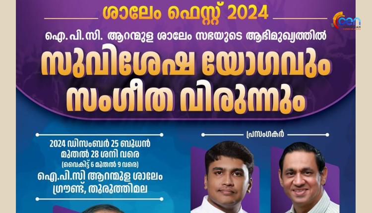 ഐ പി സി ആറൻമുള ശാലേം സഭയുടെ ആഭിമുഖ്യത്തിൽ ശാലേം ഫെസ്റ്റ് എന്ന പേരിൽ സുവിശേഷ യോഗവും സംഗീത വിരുന്നും ഡിസംബർ 25 ബുധൻ മുതൽ 28 ശനി വരെ ശാലേം ഗ്രൗണ്ടിൽ (തുരുത്തി മല ) നടക്കുന്നു.