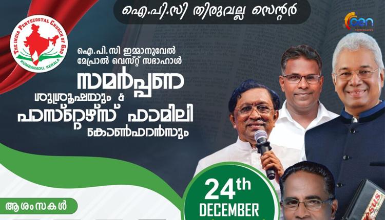 തിരുവല്ല: ഐപിസി തിരുവല്ല സെന്റർ മേപ്രാൽ വെസ്റ്റ് ഐപിസി ഇമ്മാനുവൽ സഭയുടെ സമർപ്പണ ശുശ്രൂഷയും, ശുശ്രൂഷക കുടുംബസംഗമവും ഡിസംബർ 24 ചൊവ്വാഴ്ച രാവിലെ 10 മണി മുതൽ ഐപിസി ഇമ്മാനുവൽ മേപ്രാൽ വെസ്റ്റ് സദാ ഹാളിൽ നടക്കും.