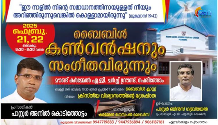പെരിങ്ങോം കേന്ദ്രമായി പ്രവർത്തിക്കുന്ന മൗണ്ട് കർമ്മേൽ ഏ.ജി ചർച്ചിന്റെ ആഭിമുഖ്യത്തിൽ ഫെബ്രുവരി 21,22, തീയതികളിൽ രണ്ട് ദിവസത്തെ കൺവൻഷൻ നടക്കും. പ്രസ്തുത കൺവൻഷനിൽ പാസ്റ്റർ അനിൽ കൊടിത്തോട്ടം വചനപ്രഘോഷണം നടത്തും. പയ്യന്നൂർ സെക്ഷൻ പ്രസ്ബിറ്റർ പാസ്റ്റർ ബിൻസ് ഗബ്രിയേൽ കൺവെൻഷൻ ഉദ്ഘാടനം ചെയ്യും. കർമ്മേൽ ഗോസ്പൽ മെലഡീസ് ഗാനശുശ്രൂഷ നിർവ്വഹിക്കും. വെള്ളി,ശനി പകൽ സമയങ്ങളിൽ ക്രിസ്തീയ വിശ്വാസത്തിൻ്റെ ശ്രേഷ്ഠത എന്ന വിഷയത്തെ ആസ്പദമാക്കി ബൈബിൾ ക്ലാസ് ഉണ്ടായിരിക്കുന്നതാണ്. ശുശ്രൂഷകൾക്ക് സഭാ ശുശ്രൂഷകൻ പാസ്റ്റർ. ഷിജു മത്തായി നേതൃത്വം നൽകും.