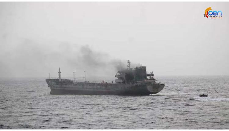 എംടി യി ചെങ് 6 എന്ന കപ്പലാണ് തീപ്പിടിച്ചത്. ദൗത്യ നിര്വഹണത്തിന്റെ ഭാഗമായി ഒമാന് ഉള്ക്കടലിലുണ്ടായിരുന്ന ഇന്ത്യന് നേവിയുടെ ഐഎന്എസ് തബറിന് ചരക്കു കപ്പലില് നിന്ന് അപായ സന്ദേശം ലഭിക്കുകയായിരുന്നു.