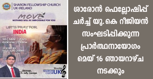 ശാരോൻ ഫെല്ലോഷിപ്പ് ചർച്ച് യു.കെ റീജിയൻ സംഘടിപ്പിക്കുന്ന പ്രാർത്ഥനായോഗം മെയ് 16 ഞായറാഴ്ച നടക്കും.
