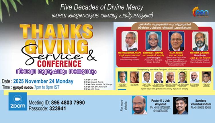 ക്രിസ്തീയ ശുശ്രൂഷയിൽ അര നൂറ്റാണ്ട് – പാസ്റ്റേഴ്സ് എബ്രഹാം ജോസഫ്, ജോർജ് സി. കുരുവിള, ജോ കുര്യൻ, എം ഡി. സാമുവൽ : സ്തോത്ര ശുശ്രൂഷ നവം. 24ന് സൂം പ്ലാറ്റ്ഫോമിൽ.