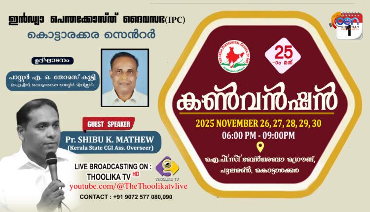 കൊട്ടാരക്കര: ഇന്ത്യാ പെന്തക്കോസ്ത് ദൈവസഭ കൊട്ടാരക്കര സെന്ററിന്റെ 25 മത് സെന്റർ കൺവെൻഷൻ 2025 നവംബർ മാസം 26 ബുധൻ മുതൽ 30 ഞായർ വരെ കൊട്ടാരക്കര ഐപിസി ബേർശേബാ ഗ്രൗണ്ടിൽ വച്ചു നടത്തപ്പെടുന്നു.
